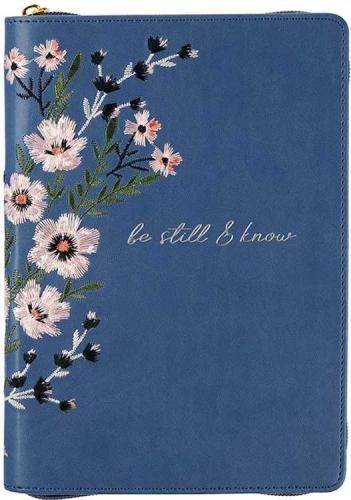 Set some time apart to journal your thoughts, adoration, and prayers in the Be Still Floral Embroidered Blue Faux Leather Classic Journal with Zippered Closure. The daily Scripture verses paired with the beautiful design will prompt your heart and mind to become still for a time of worship.