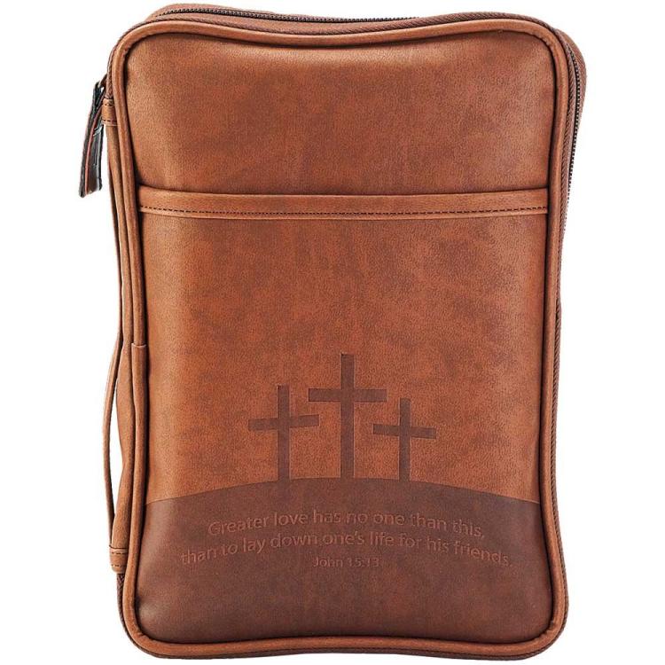Golgotha Crosses Bible Cover Thinline Size Our attractive faux leather Golgotha cross Bible cover features front pocket with triple cross design and the imprinted verse “”Greater love has no one than this, than to lay down one’s life for his friends”” from John 15:13. Has convenient side carrying handle, nylon reinforced stitching, lay flat construction and non-rusting, self-repairing zipper. The Thinline size holds a Bible or book up to 6 1/4″” x 9 1/4″” x 1 1/4″”.